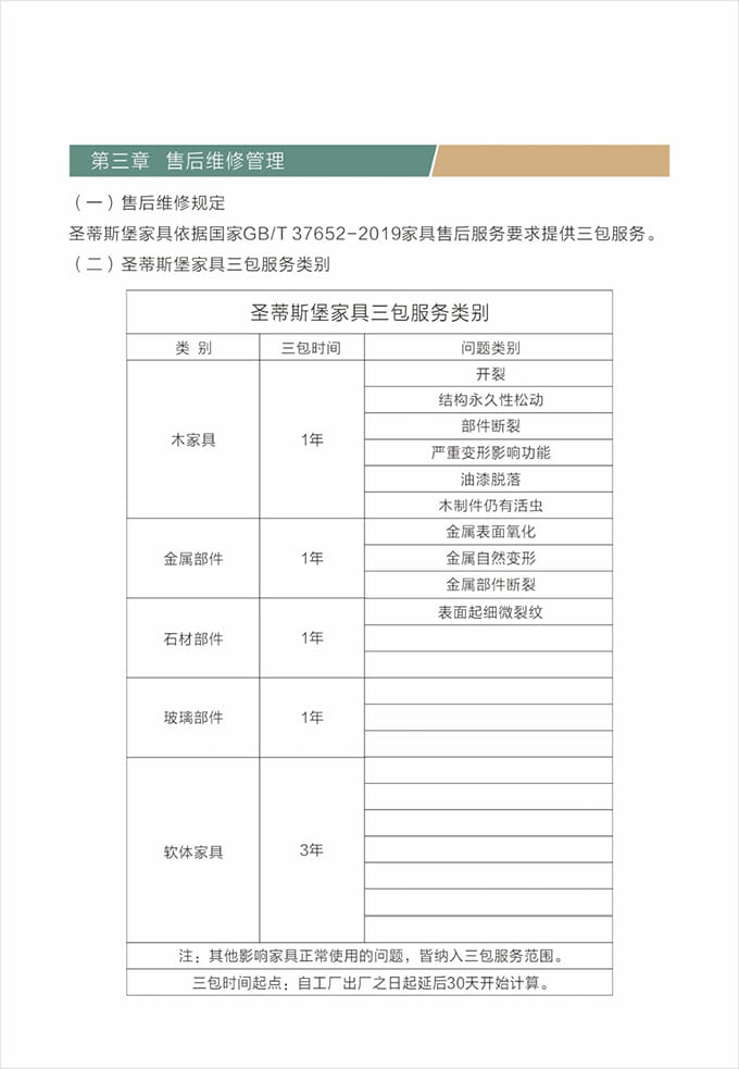 維修人員上門維修處理問題上門前必須著圣蒂斯堡統(tǒng)一工作服,佩戴上崗證并盡量攜帶維修處理過程中可能會(huì)使用到的工具和備用配件例:工具、備件、筆記本、手套、腳套、收據(jù)和《圣蒂斯堡售后服務(wù)信息單》等物品。