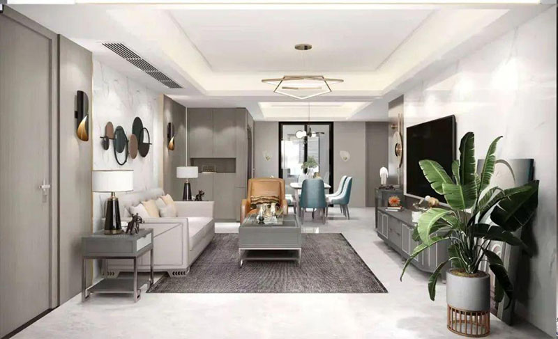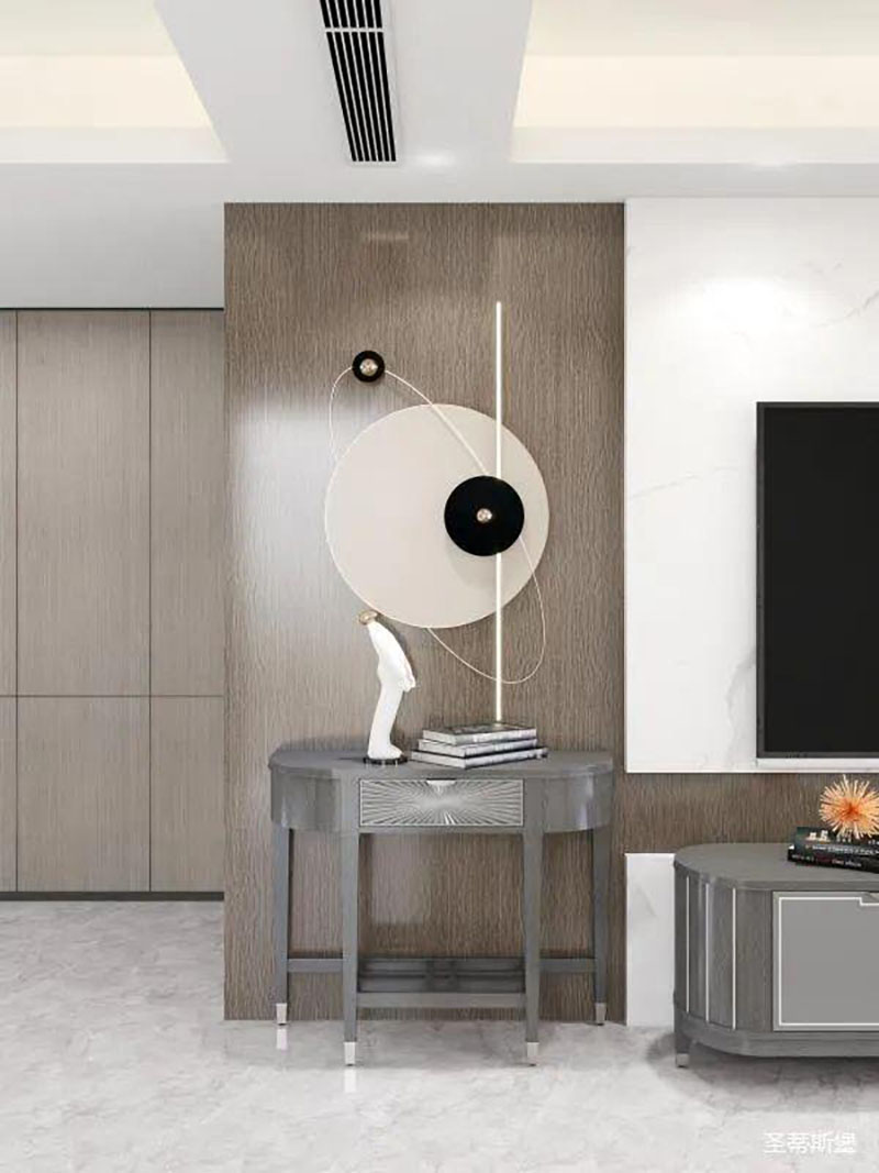 ▲設計師巧妙的運用填充藝術,將客廳電視與沙發(fā)背景色彩相呼應,利用凹凸互補的設計手法,傳遞著空間時尚。莫蘭迪實木家具,配以同色系的高級金屬底座,將精致輕奢從細節(jié)中脫穎而出。