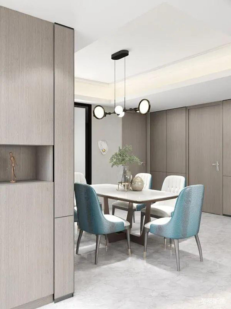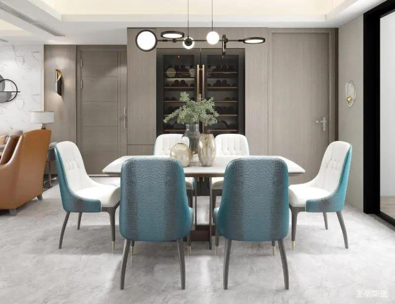 ▲澄亮湖藍的餐桌椅,一定是空間的點睛之處,溫柔跳脫的色彩,賦予了生活多姿多彩的體驗。經(jīng)典黑的簡約燈飾,在不忘溫馨氛圍的同時,也引領著造型界的時尚潮流。