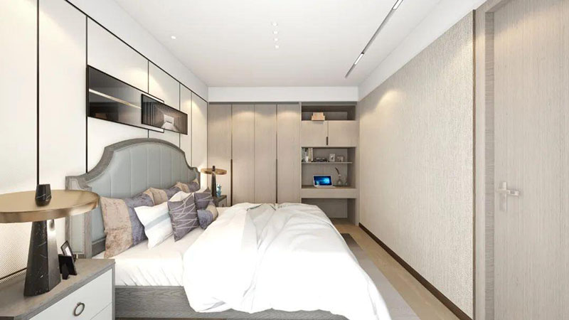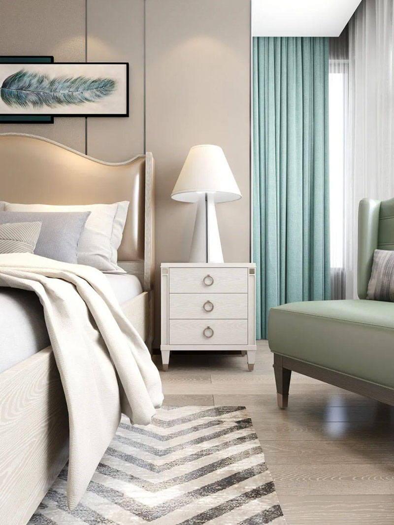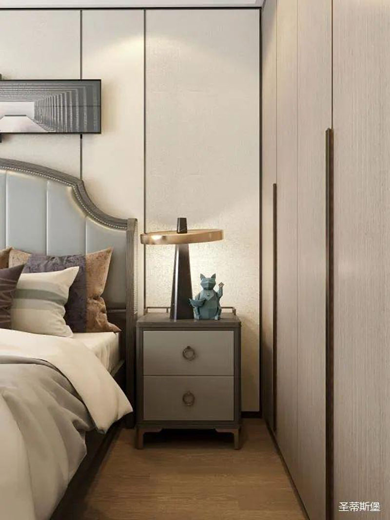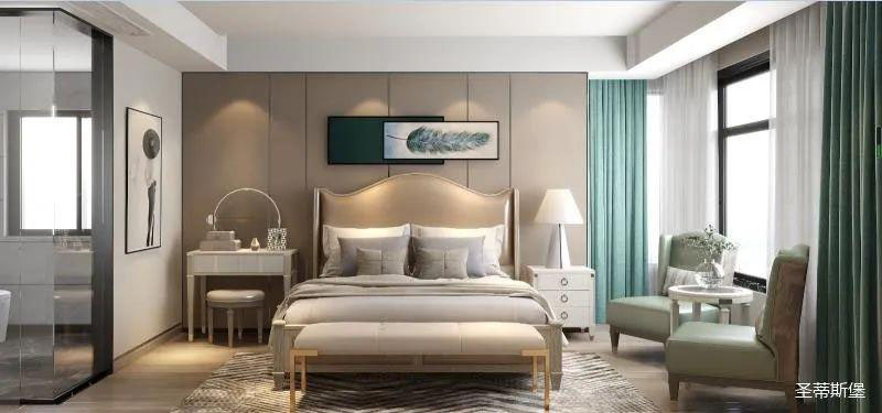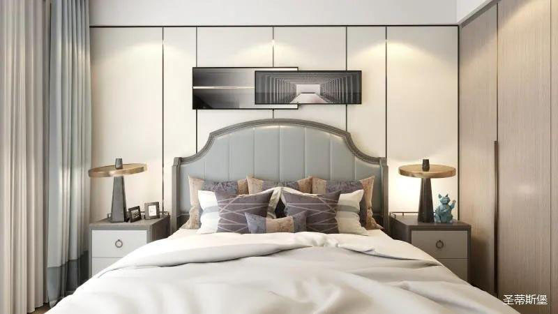 ▲次臥空間主要是以淺色為底調,大面積的莫蘭迪色與淺色相平衡。極強線性裝飾畫帶來的延伸感讓視覺煥然一新。少許的金屬元素攝入,瞬間提升了空間的精致度,將溫潤雅致與時尚輕奢糅合在同一空間里,每一處都洋溢著浪漫的氣息。