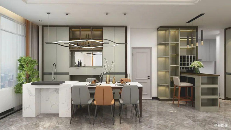 餐廚開放式設(shè)計(jì),令空間更為清透明亮。色系一致的餐邊柜,封閉與開放式儲(chǔ)******立又統(tǒng)一,正面鑲嵌玻璃,延伸了視覺空間,僅用簡(jiǎn)約線條區(qū)分,將意式極簡(jiǎn)形式展現(xiàn)。造型別致的金屬線條燈飾,給整體空間帶來(lái)了靈動(dòng)感。