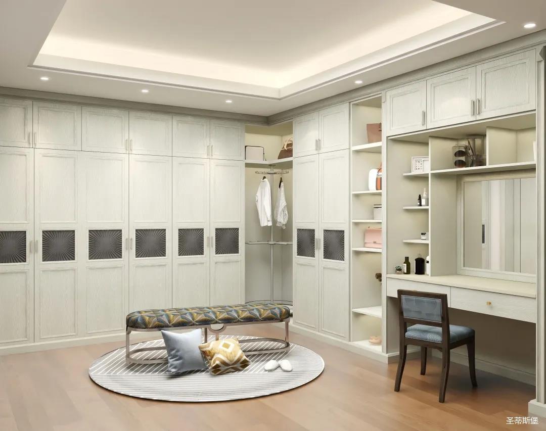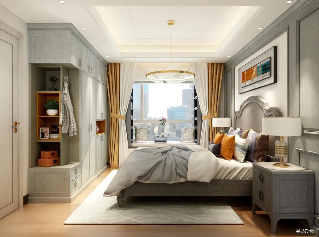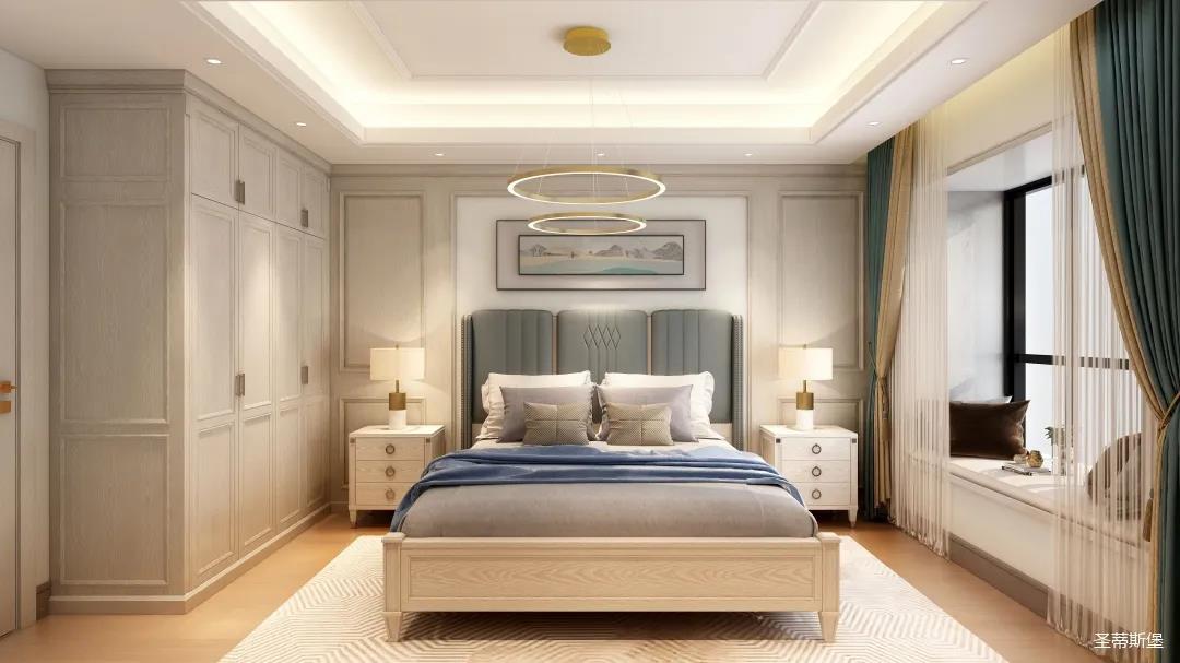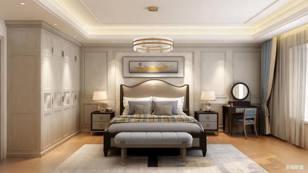 ▲業(yè)主喜歡低調(diào)輕奢的空間格調(diào),設計師從功能出發(fā),賦予空間舒適的感受,打造專屬的衣帽間,滿足業(yè)主日常買買買的儲物喜好。同時也將藝術(shù)元素融入美式現(xiàn)代風格,利用空間的色彩、紋理、家具、配飾、光線等表達空間情緒,再以黃銅金屬加持,營造溫馨愜意的家居睡眠氛圍。