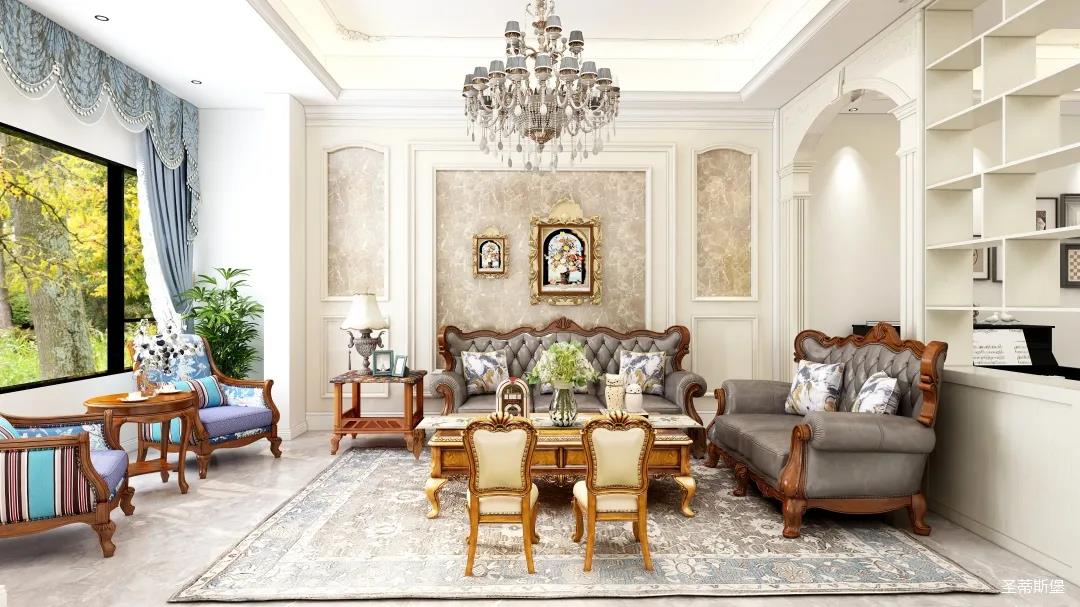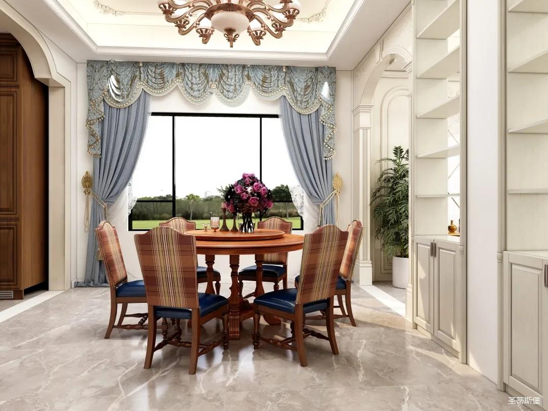 設(shè)計(jì)師將浪漫與莊嚴(yán)的氣質(zhì)從空間細(xì)節(jié)凸顯,半圓形的拱門(mén)和轉(zhuǎn)角的石砌,盡顯雍容華貴。綠植擺設(shè)清新不落俗套,白色線條使入墻空間層次感更為強(qiáng)烈,實(shí)木與歐美裝飾搭配的拱門(mén),挑高的大面窗客廳,都令人心神蕩漾。