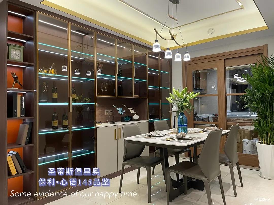 ▲餐廳一面及頂?shù)耐该鞴耋w,以簡練的金屬線條分割出收納空間,讓立面視覺更顯精致干凈。餐邊柜設(shè)置了臺(tái)面、全玻璃展示區(qū)以及隱藏收納區(qū),滿足了日常生活中多樣的收納需求。