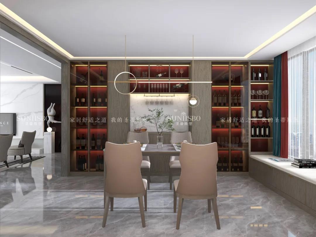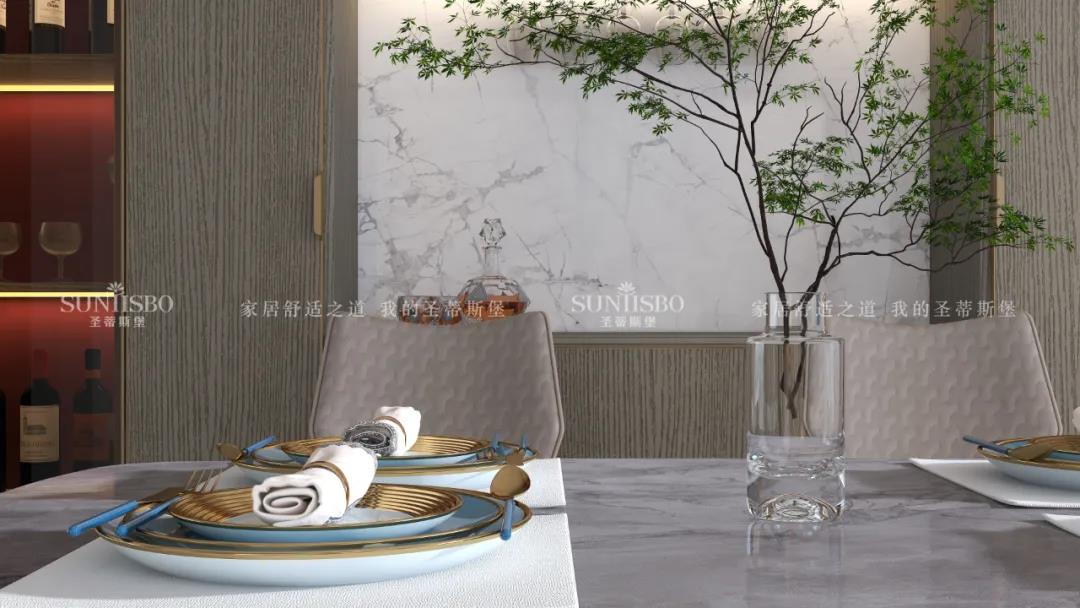 簡奢餐桌與玻璃大立柜,將空間簡化,帶來了純粹的空間視覺效果。金色鑲邊的點綴,為這份純粹增添了奢華質感。極簡玻璃定制柜體,拉開了大空間的開闊視野,光影交匯間,硬朗的氣質與柔和的自然光產(chǎn)生了趣味的互動,為空間提供了更具藝術張力的奢享用餐體驗。