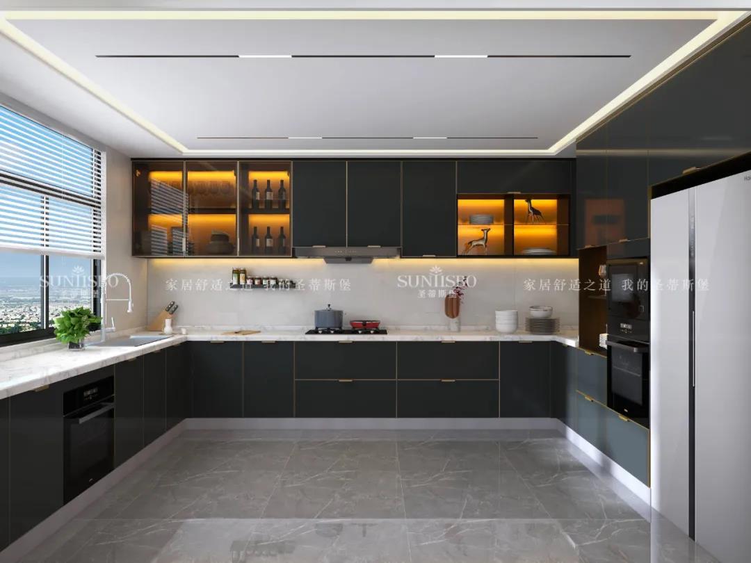 視覺色彩是激活感官的情緒支點,以色彩為重心的櫥柜系統(tǒng),喚醒了簡奢廚房的關鍵所在。亮色金屬與深色實木柜體形成撞色櫥柜,極具空間爆發(fā)力。在深色柜體包裹中展現(xiàn)金屬、玻璃、實木的高級質感,剛毅線條交錯延續(xù),一秒就點燃了時尚潮流的生活態(tài)度。