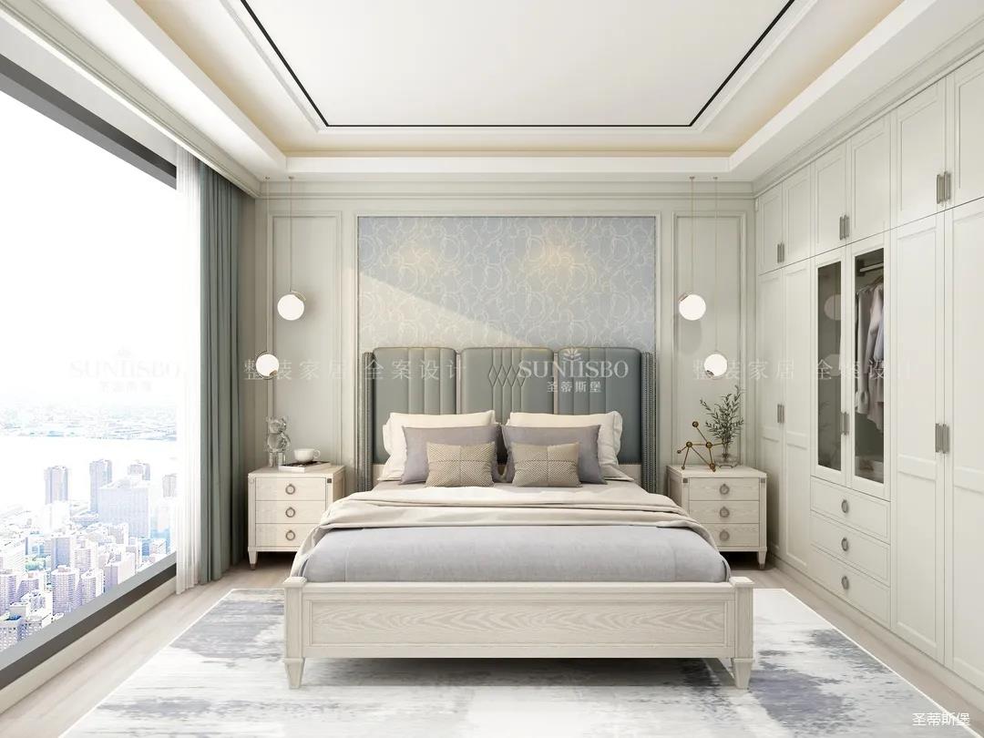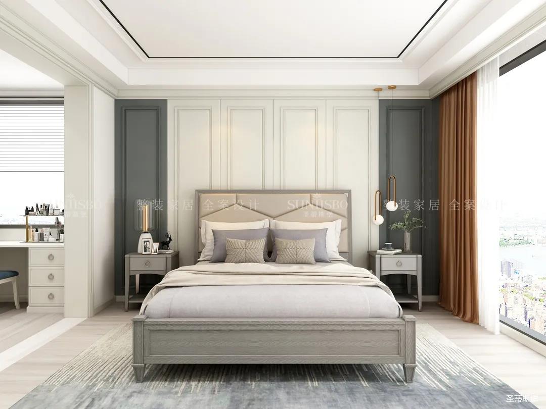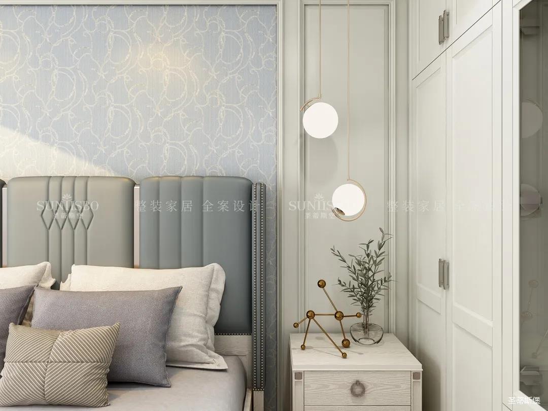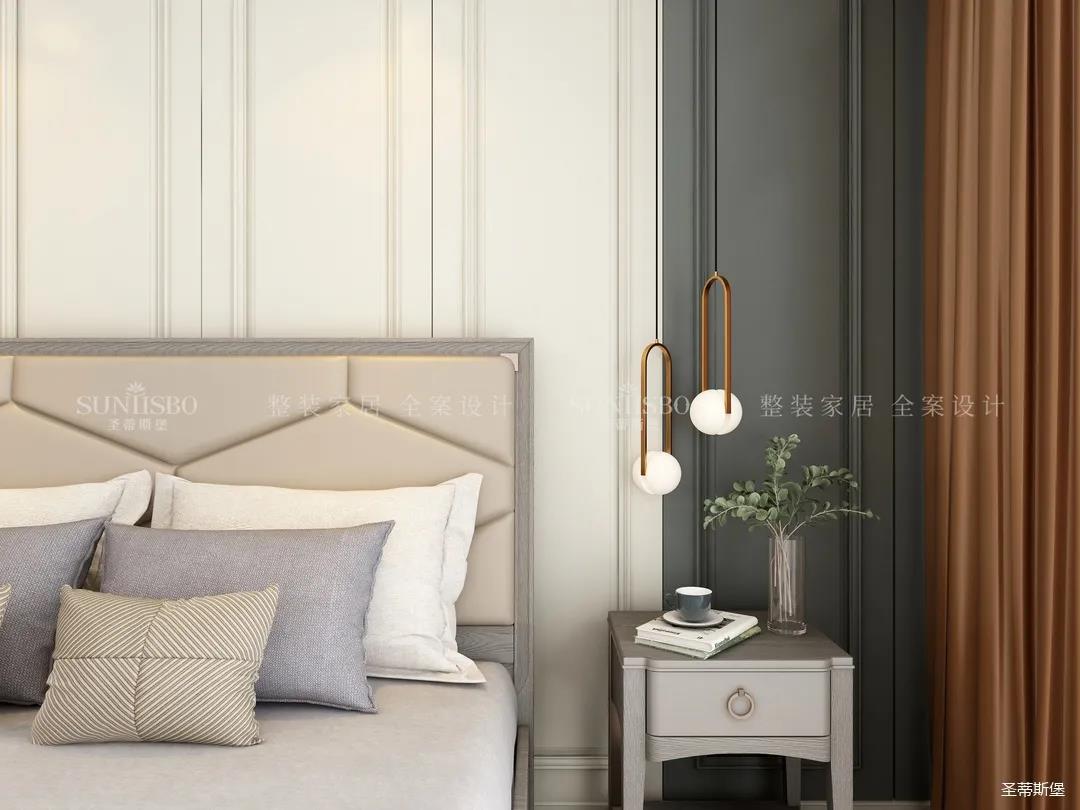 主臥在最大程度上表達(dá)了業(yè)主太太最?lèi)?ài)的線性美,背景木飾面保留了純粹的視覺(jué)體驗(yàn),深灰與米白按比例調(diào)和搭配,深淺碰撞,在跟隨時(shí)尚的同時(shí),也形成了秩序感的層次劃分。
