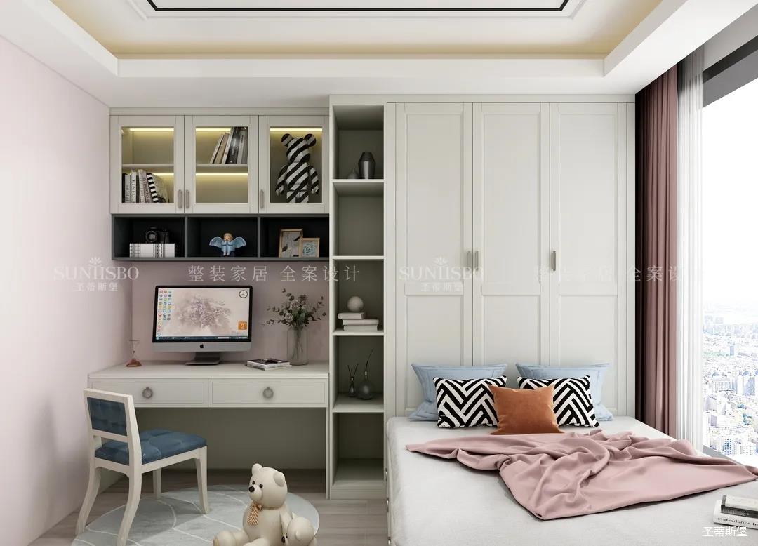 考慮到兒童身體免疫系統(tǒng)尚未成熟,抵抗力相對(duì)會(huì)較弱,所以空間采用了E0級(jí)全實(shí)木打造,少女粉墻體與仿古白柜體對(duì)應(yīng)搭配出兒童空間的平衡點(diǎn),典型的榻榻米+書(shū)桌的設(shè)計(jì),既保證了足夠的學(xué)習(xí)區(qū),還兼顧著收納功能。