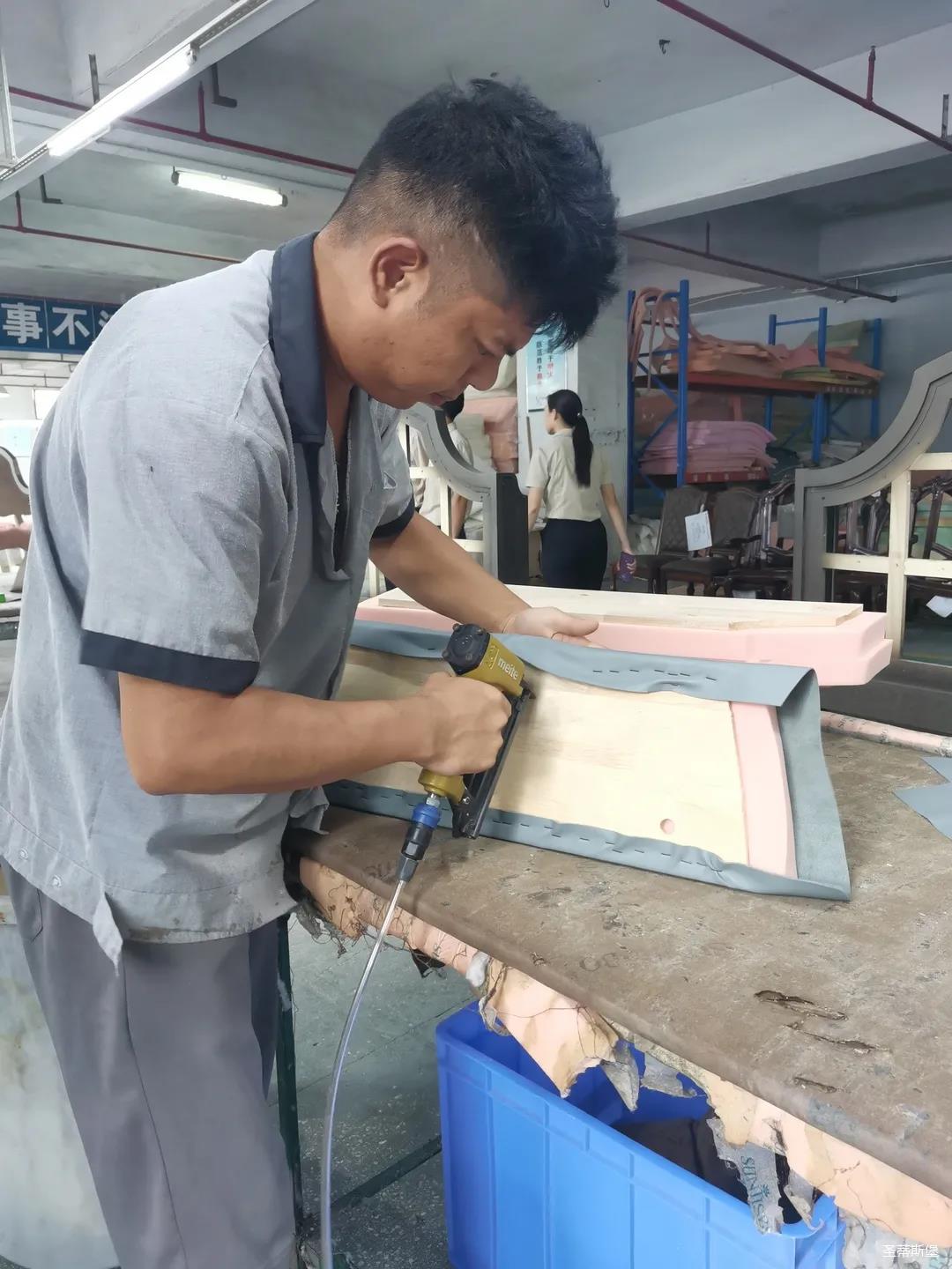 本屆技能競(jìng)賽設(shè)置為工業(yè)組和商業(yè)組,共設(shè)競(jìng)賽項(xiàng)目8項(xiàng),其中,工業(yè)組競(jìng)賽包含了打滾邊、打銅釘、自身產(chǎn)品組裝、成品組裝、柜體噴底色、修色、板材開(kāi)料等七大細(xì)項(xiàng)。商業(yè)組以組裝辦公臺(tái)、床頭柜為主。