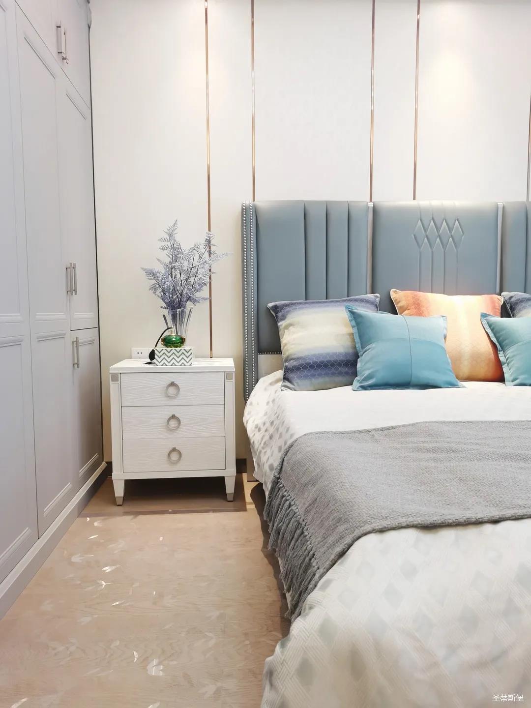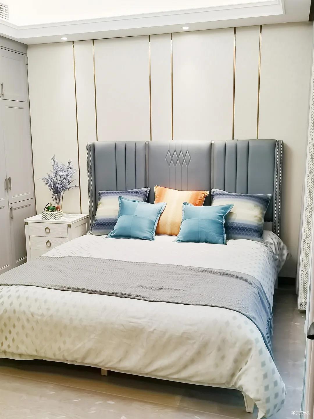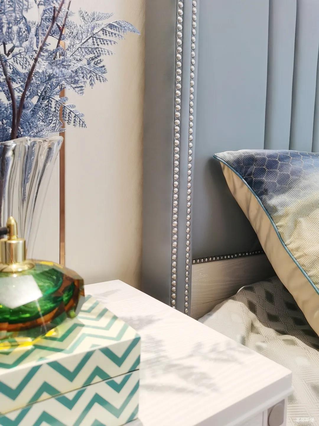 一樓的房間業(yè)主是作為長輩房,采用輕奢的背景墻面,結(jié)合亮眼的金屬線條設(shè)計(jì),空間顯得時(shí)尚又不失沉穩(wěn)。莫蘭迪色的淺藍(lán)床屏,在無主燈設(shè)計(jì)與自然光線的碰撞下醞釀出不同的光影美感。