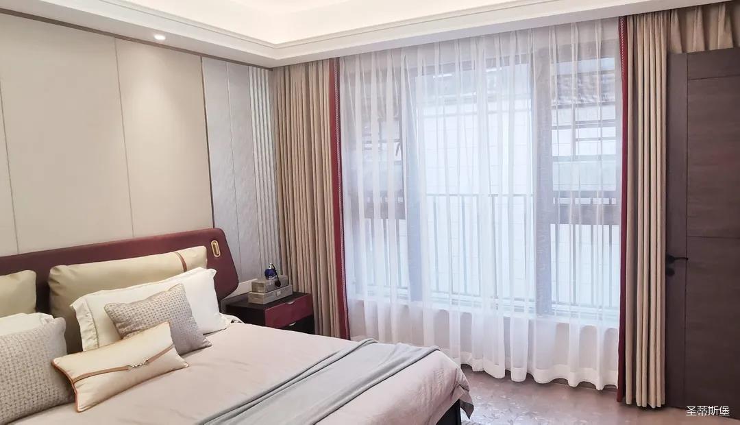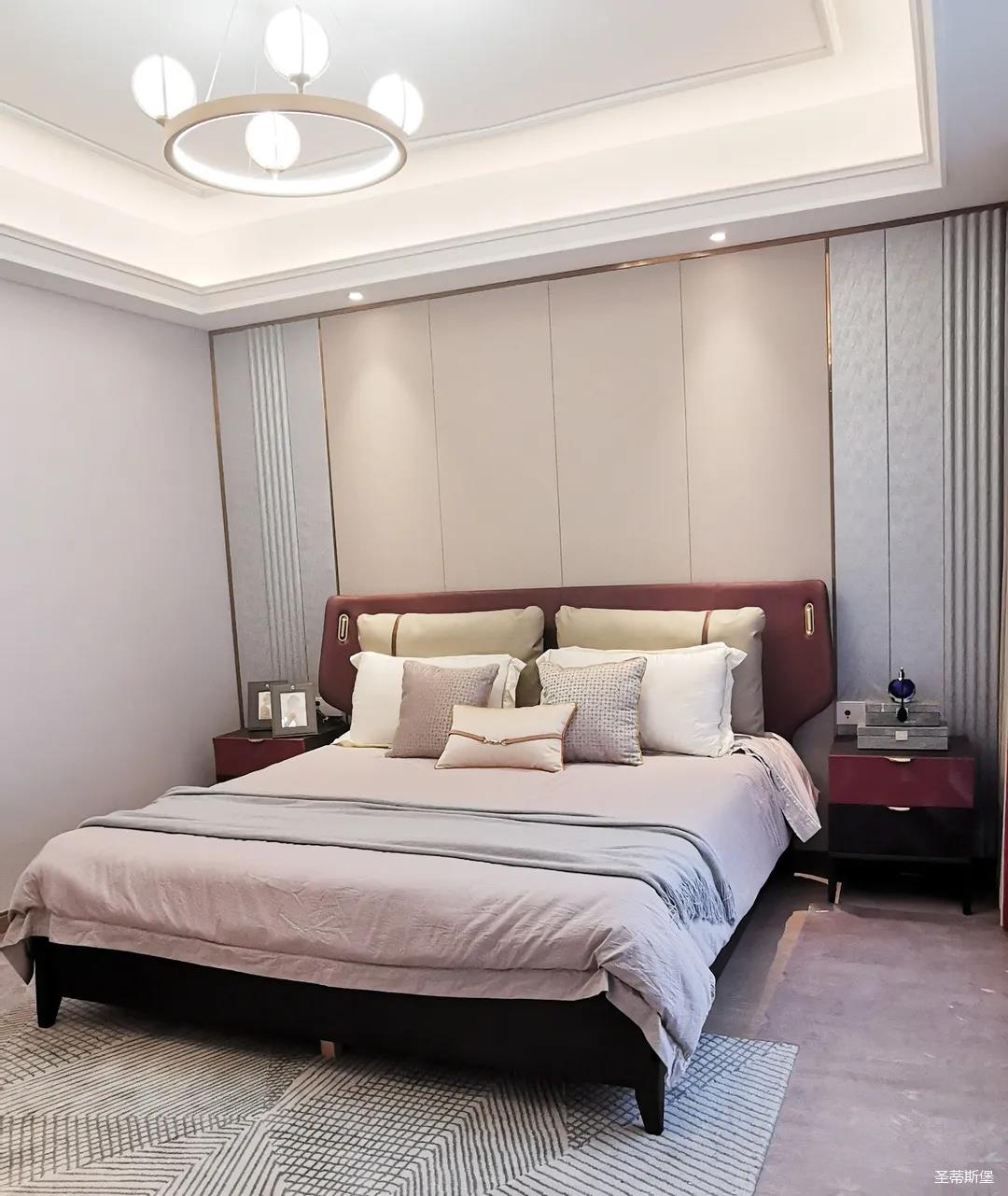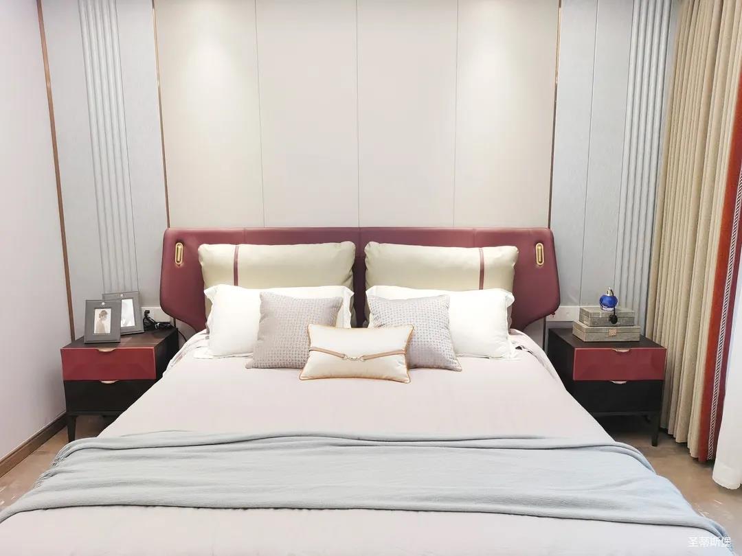 三樓的主人房設(shè)計(jì)風(fēng)格更偏向簡約,浪漫的酒紅色床屏運(yùn)用了曲面造型,融合了極簡主義美學(xué)和輕奢元素,小型夜間感應(yīng)燈設(shè)計(jì)讓每一處細(xì)節(jié)都充滿著時(shí)尚優(yōu)雅的氣息。夜間倚靠在厚實(shí)的軟包上,時(shí)光好像在不知不覺中慢了下來,讓我們能品味和咀嚼生活的氛圍。