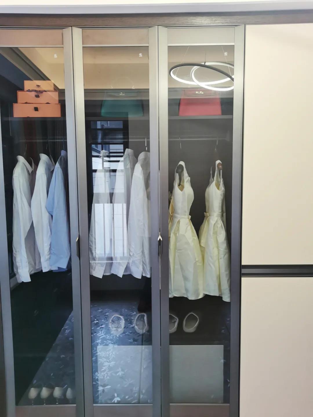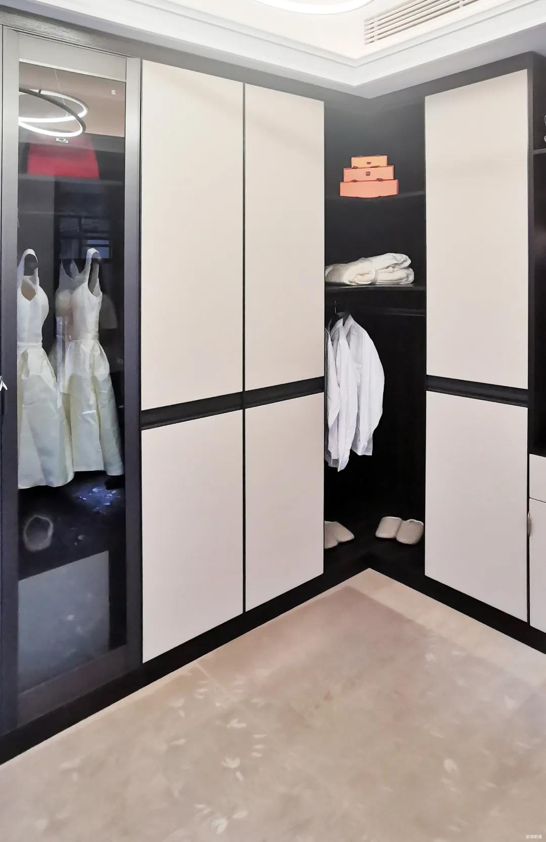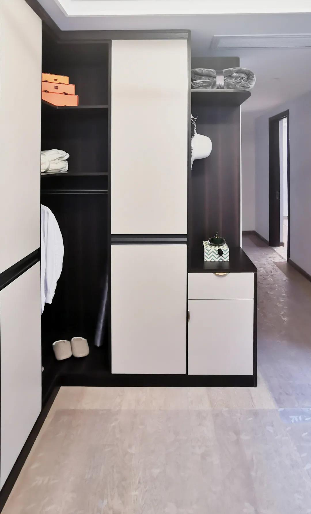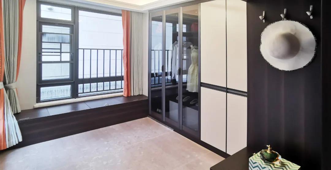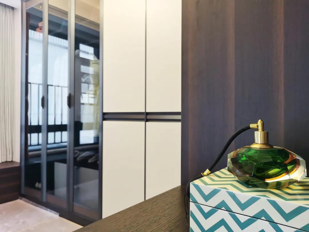 衣帽間以現(xiàn)代極簡設(shè)計(jì)手法引入輕奢元素,借助實(shí)木與金屬組合打破了傳統(tǒng)儲(chǔ)物區(qū)的沉悶感,煙熏色橡木紋的定制柜體,色澤好似一杯溫暖醇香的摩卡,令空間層次感與立體感的格調(diào)頓生,予以沉穩(wěn)舒適感官體驗(yàn)。
