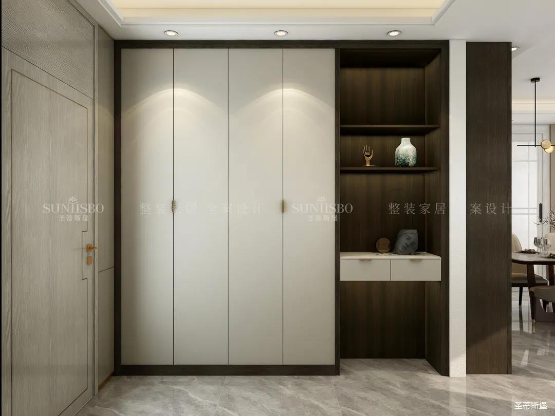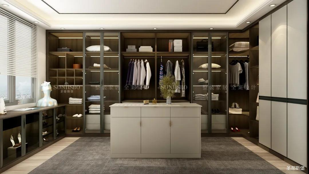衣帽間采用了虛實(shí)結(jié)合的設(shè)計(jì),構(gòu)筑起規(guī)整而有序的置物區(qū)域和功能齊全的收納系統(tǒng),煙熏色實(shí)木作為空間的主要元素,環(huán)抱著整個(gè)衣帽間,張揚(yáng)又不失沉穩(wěn),恰到好處地搭配金屬玻璃置頂高門(mén)和感應(yīng)燈光系統(tǒng),挑高了空間效果,也詮釋著現(xiàn)代極簡(jiǎn)線條美感和對(duì)極致的生活追求。