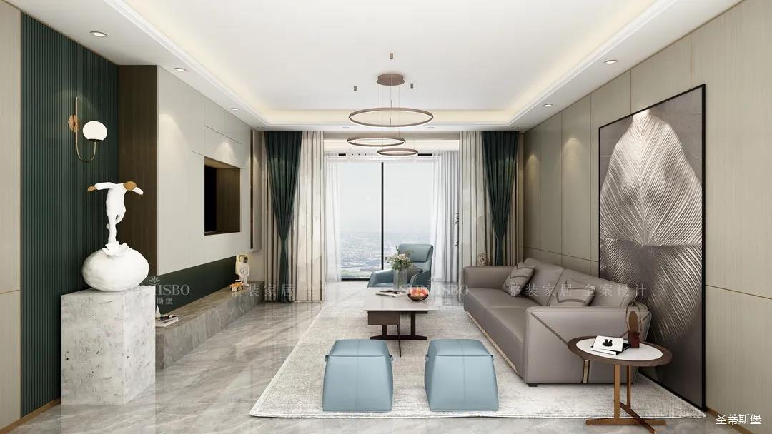 客廳色彩搭配極為巧妙,淺色木飾面與深綠木欄柵搭配讓空間高級(jí)感隨即上升,墻面的虛實(shí)裝飾畫(huà)作為點(diǎn)睛之筆,讓看似空曠簡(jiǎn)單的沙發(fā)背景墻多了份藝術(shù)氣息。