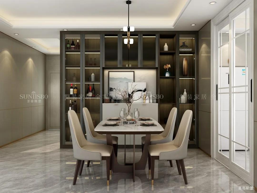 餐廳全開(kāi)放式的布局,遵循了家具收納的28原則,20%的封閉式儲(chǔ)納,收納不常用的雜亂物品,80%的半開(kāi)放設(shè)計(jì),展示軟裝飾物。餐邊柜將玻璃、金屬、實(shí)木材質(zhì)糅合分配,讓空間質(zhì)感倍增的同時(shí),也讓用餐空間多了一份家的溫度。