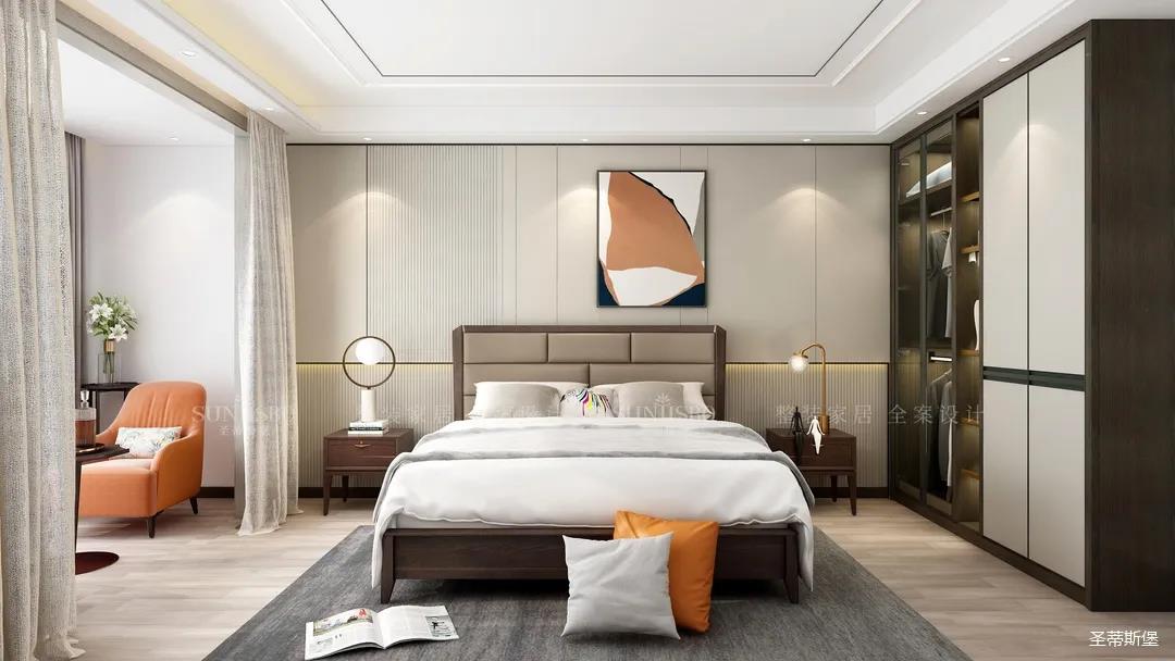 主臥運(yùn)用了大面積落地窗圍合,整體的無(wú)主燈設(shè)計(jì),凸顯了空間極簡(jiǎn)潮流。無(wú)限引入窗外的移動(dòng)光線,輕松為空間注入陽(yáng)光的溫度,u型極簡(jiǎn)金屬懸置著一個(gè)白色造型燈,讓空間從靜謐中生出無(wú)窮的變幻。家具設(shè)計(jì)偏向簡(jiǎn)約舒適,造型雖不奪目,但細(xì)節(jié)質(zhì)感卻能經(jīng)得起時(shí)光的琢磨與品味。