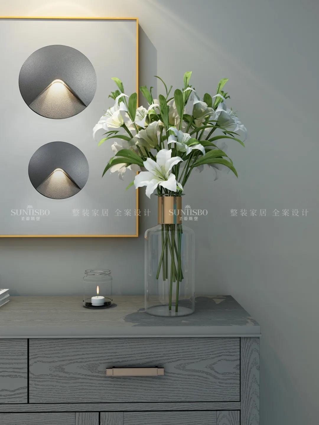 入戶側面設計一字型玄關,腰部,底部留空做層板,便于隨手放置鑰匙、鞋包等物品,中間留空設計為開放展示區(qū),加上軟裝飾品點綴,達到業(yè)主對品質生活追求的理想狀態(tài)。應女主人要求,玄關還加長延伸出妝鏡和換鞋凳,讓動線自然流暢。