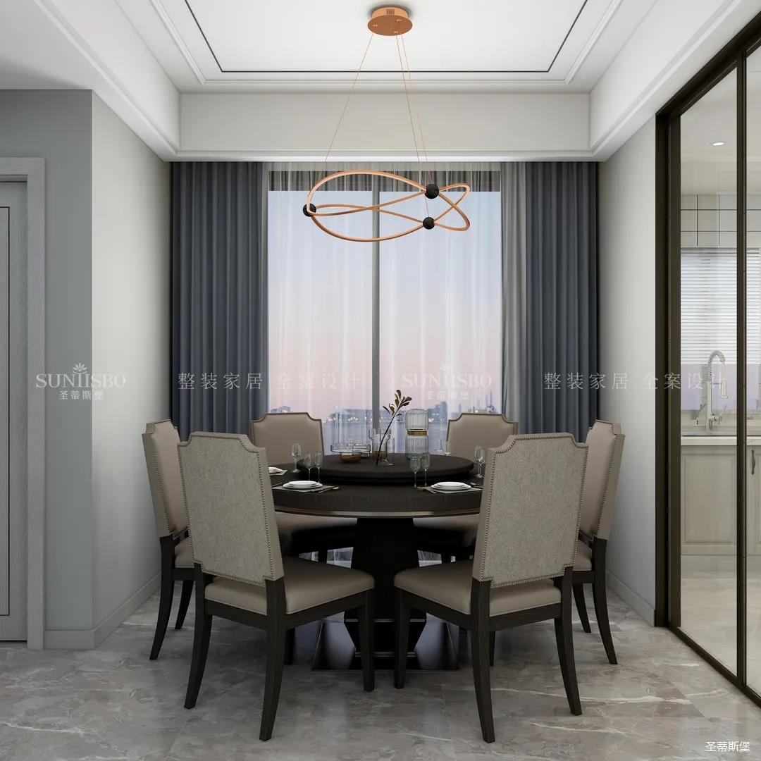 餐廳空間由于戶型空間有限,僅用淺色的護墻與深色的餐桌椅,在視覺上加深空間的縱深感,打造了滿足用餐、會客、社交的多重需求空間,把業(yè)主對一家人圍桌用餐的憧憬變成可落地居家場景。
