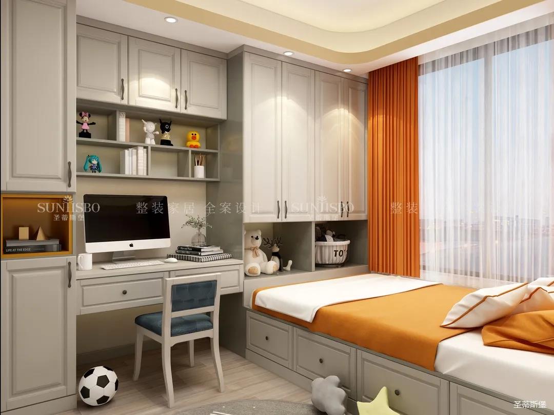 為給小朋友提供良好的居住環(huán)境,兒童房功能一應俱全,兼具開放式與封閉收納,將兒童的學習區(qū)與休息區(qū)合理劃分,打造了一個良好的生活習性,仿古白的整體柜,巧妙的將明亮橙作為撞色,令空間充滿童趣與活力。
