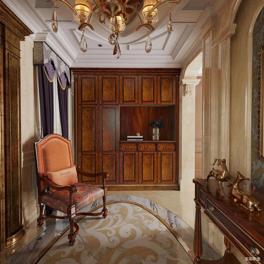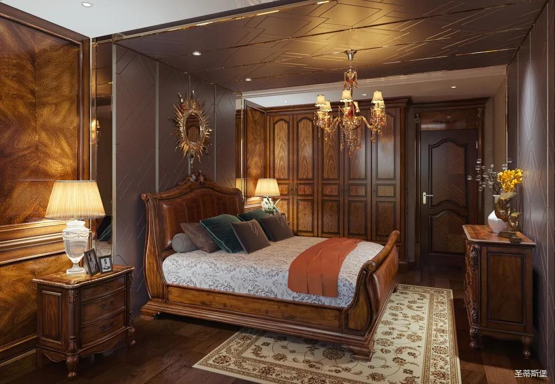 主臥整體設(shè)計(jì)是美式與現(xiàn)代的完美整合,既保留了純正美式的形和實(shí)木雕刻藝術(shù),又具有濃重的美式配色,濃濃的藝術(shù)氣息不自覺(jué)在浪漫的美式空間流淌。流暢的弧線花飾以及豐富的木作線條別具匠心。大氣穩(wěn)重與舒適雅致并重,并借由開(kāi)放的布局、靈活的動(dòng)線,共同促成了整個(gè)空間極具復(fù)古浪漫的情調(diào)。