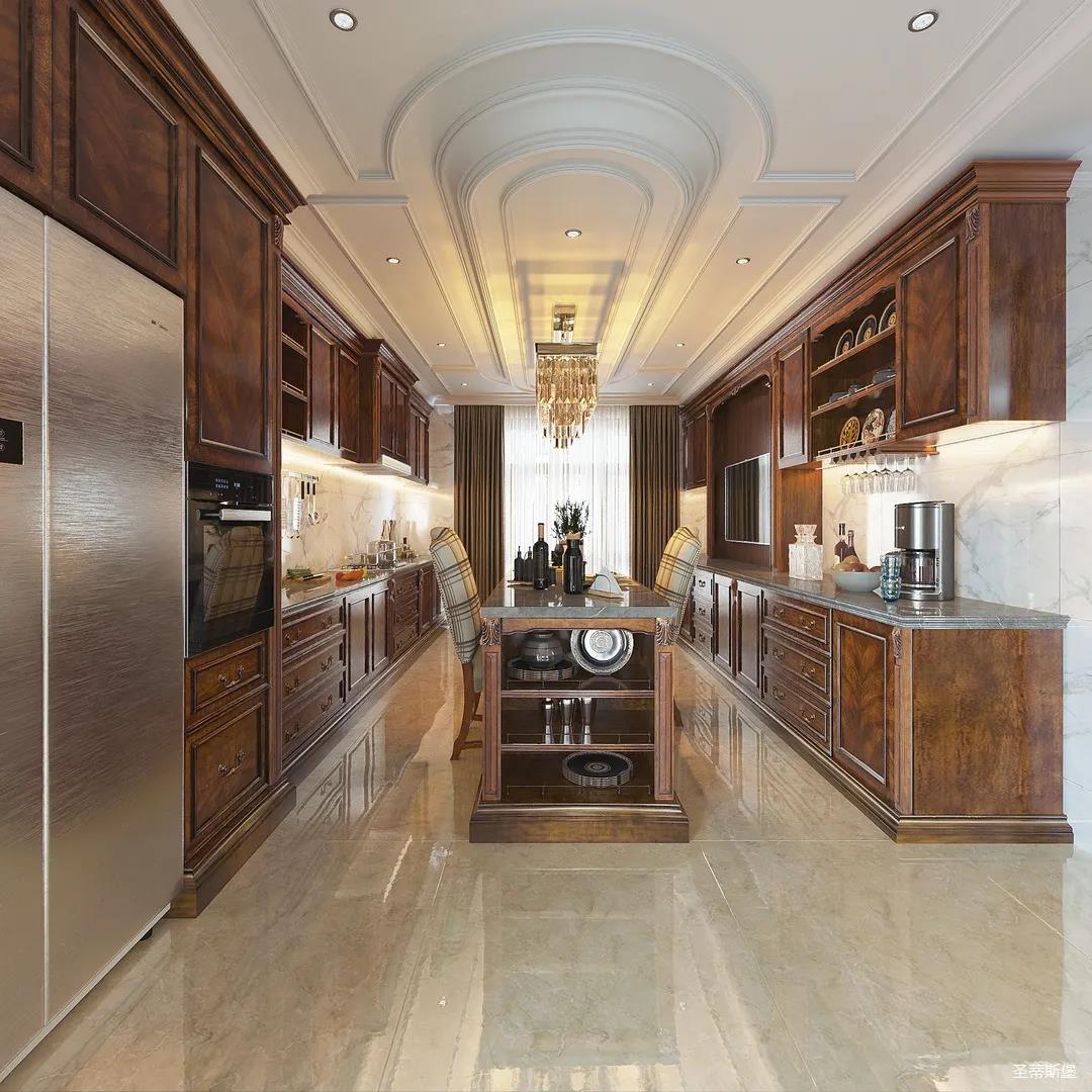 西廚設(shè)計(jì)更為統(tǒng)一,女業(yè)主喜好柔美優(yōu)雅的視覺(jué)效果,因此設(shè)計(jì)師特意將吊頂轉(zhuǎn)角做了圓弧處理,使冷峻的空間略帶圓潤(rùn),形成精致協(xié)調(diào)的空間格局。簡(jiǎn)潔的石膏吊頂與吧臺(tái)一致延伸,讓廚房視覺(jué)空間得以擴(kuò)大。金屬元素水晶吊燈,增加了空間的精致感,美式定制柜體將古典元素與現(xiàn)代電器相糅合,交錯(cuò)產(chǎn)生一種自然的違和感。